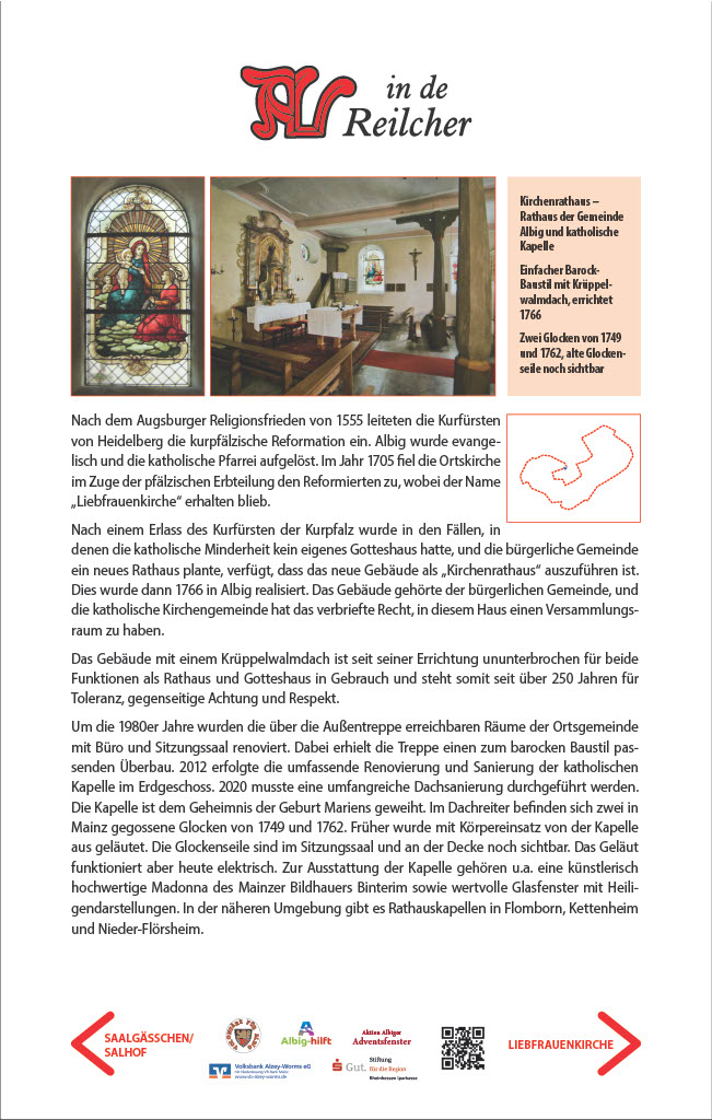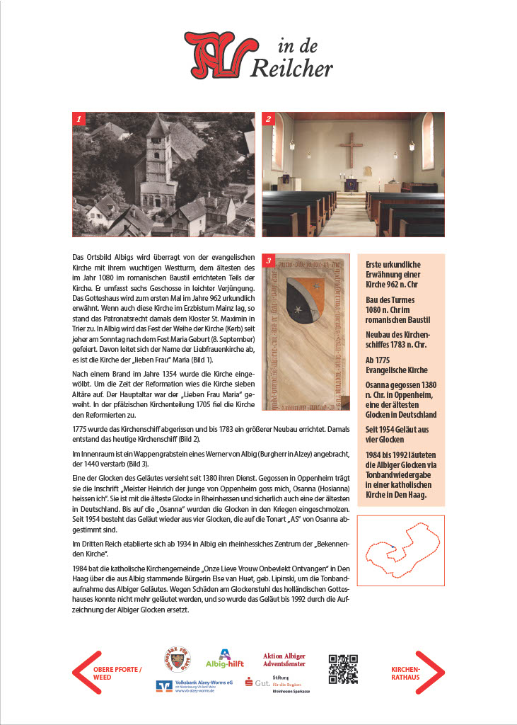 Die Albiger Reilchen (von lateinisch „Rivolus“ = Durchgang) sind ein einzigartiges historisches Wegesystem in der rheinhessischen Weinbaugemeinde Albig. Diese jahrhundertealten Wege verbinden noch heute die Ortsstraßen mit dem historischen Dorfgraben und folgen teilweise den ursprünglichen Bachläufen. Kommen Sie vorbei und erleben Sie die faszinierende Reilchen-Route.