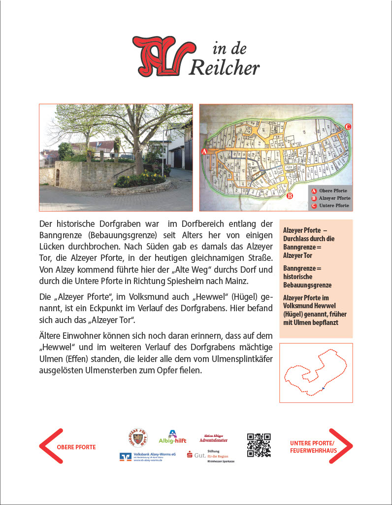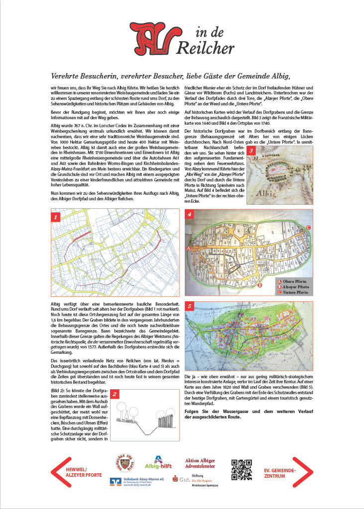 Der Dorfgraben bildete jahrhundertelang die sogenannte „Banngrenze“ – die historische Bebauungsgrenze von Albig. Innerhalb dieser Grenze galten die Regelungen des Albiger Weistums von 1577, einer historischen Rechtsquelle für das Gemeindegebiet. Der Dorfgraben war nur an drei Stellen durch Tore („Pforte“) durchbrochen, die als Zugänge zum Ort dienten. Treten Sie ein: