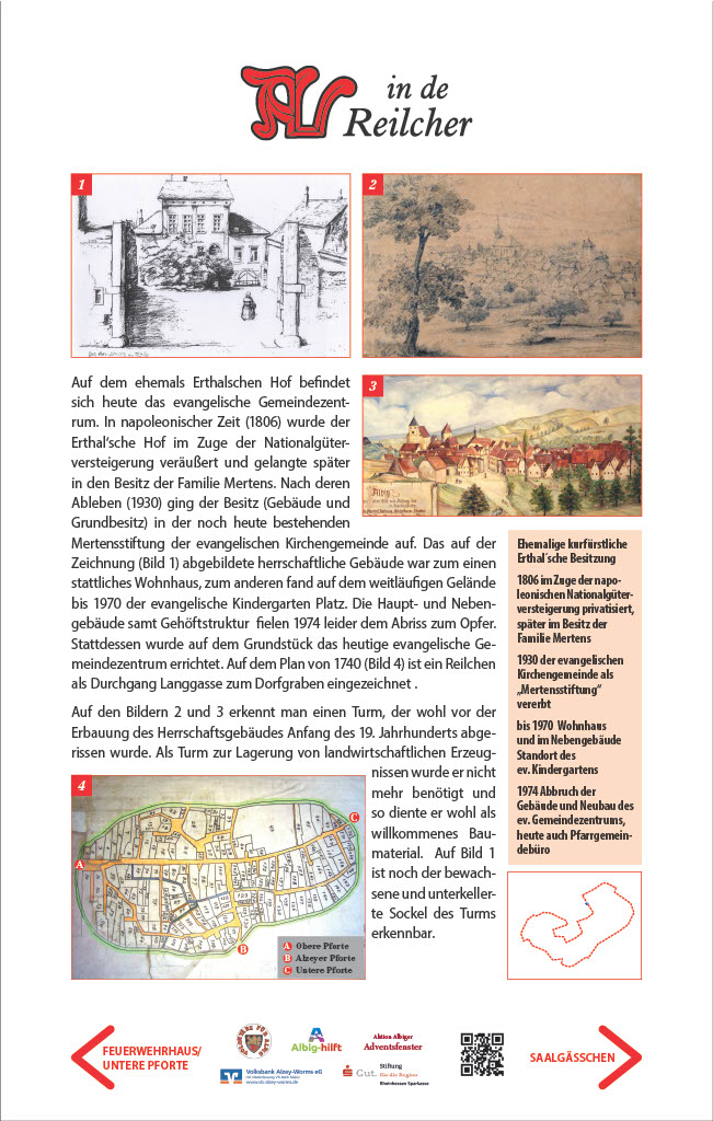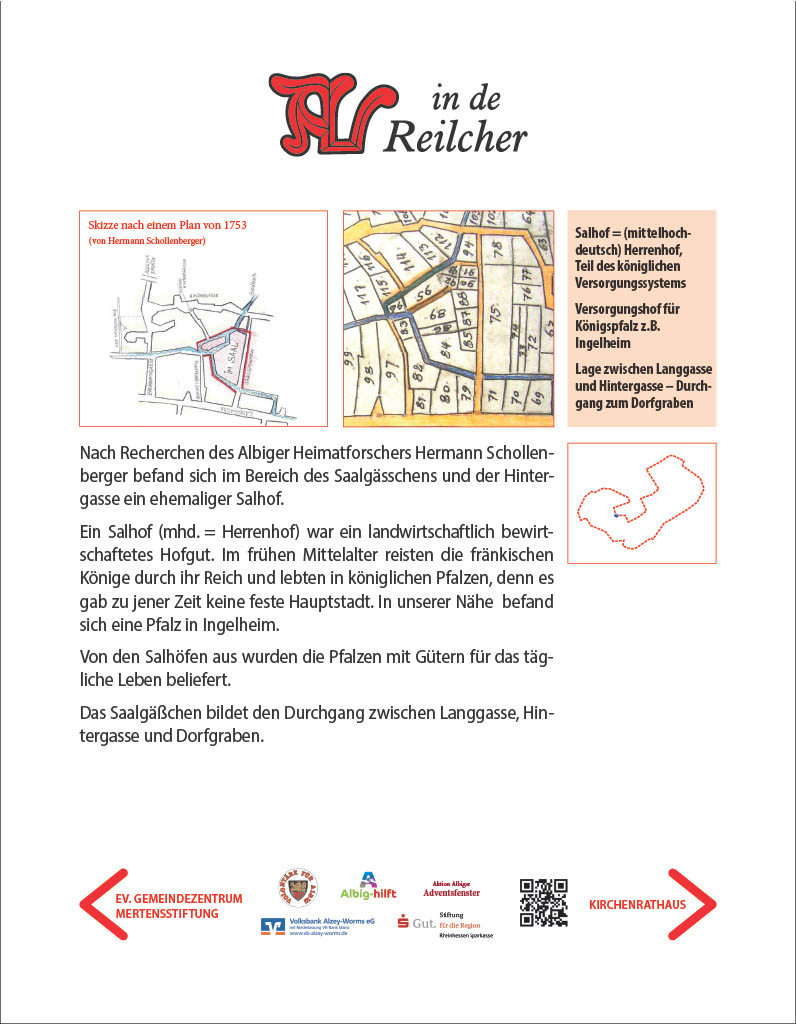 Standort eines ehemaligen Salhofs (Herrenhof), der im Mittelalter die Königspfalz in Ingelheim mit Gütern versorgte. Verbindung zwischen Langgasse, Hintergasse und Dorfgraben.